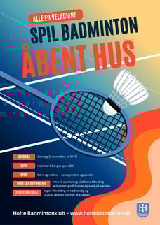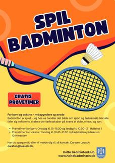 Alle børn og voksne er velkomne til at prøve at spille badminton. Det er for både begyndere og øvede. Det foregår i Holtehal 1, og du kan låne en ketcher, hvis du ikke har en.